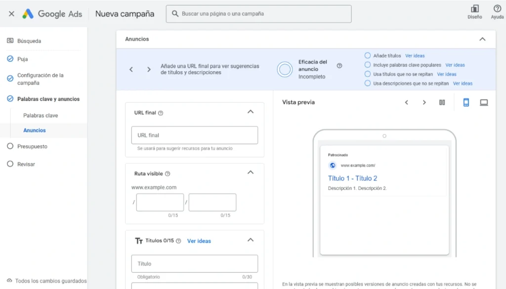 Debes identificar qué términos busca tu cliente ideal en Google mediante la optimización de palabras clave. No basta con elegir las más populares: hay que encontrar las que realmente convierten. - Crea un primer anuncio persuasivo